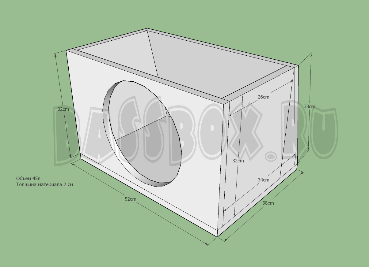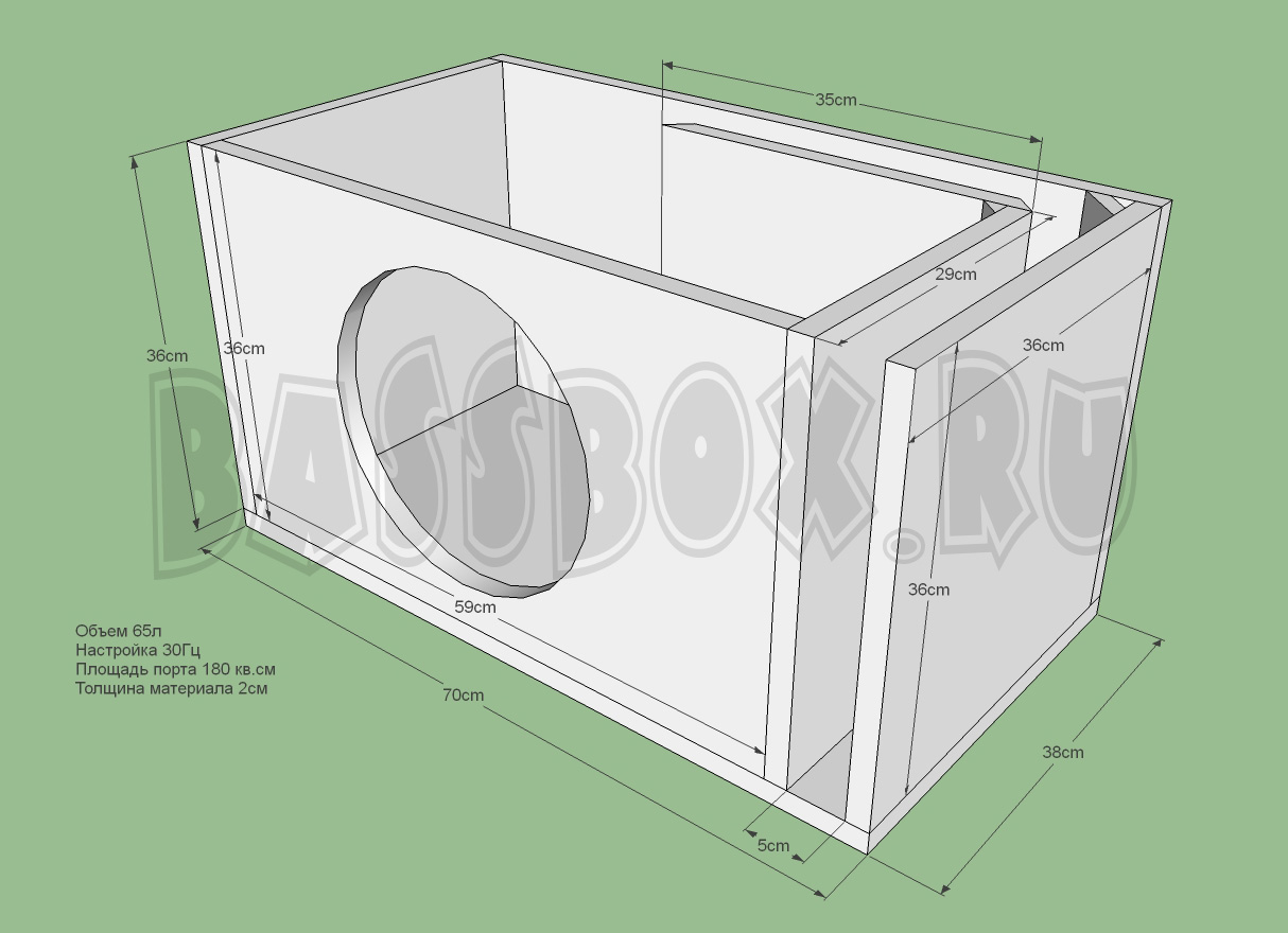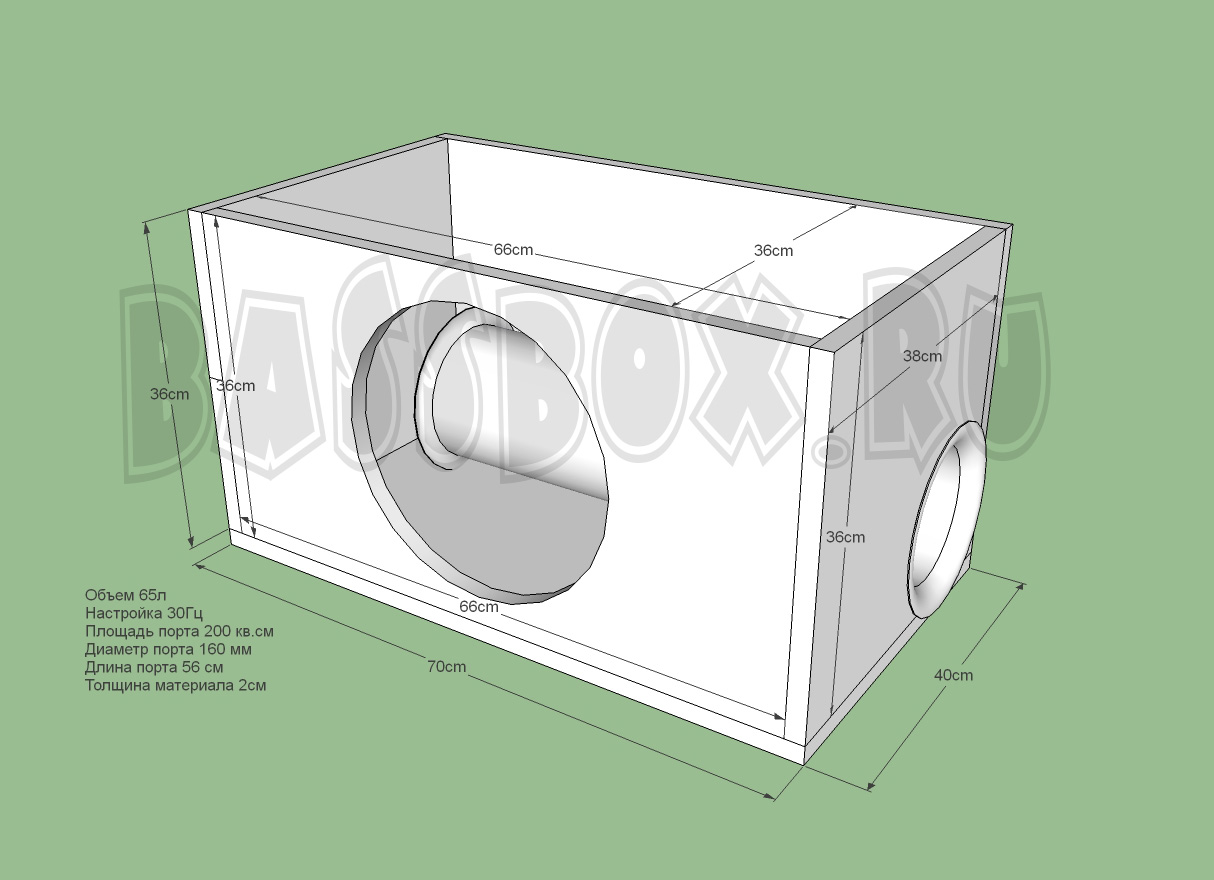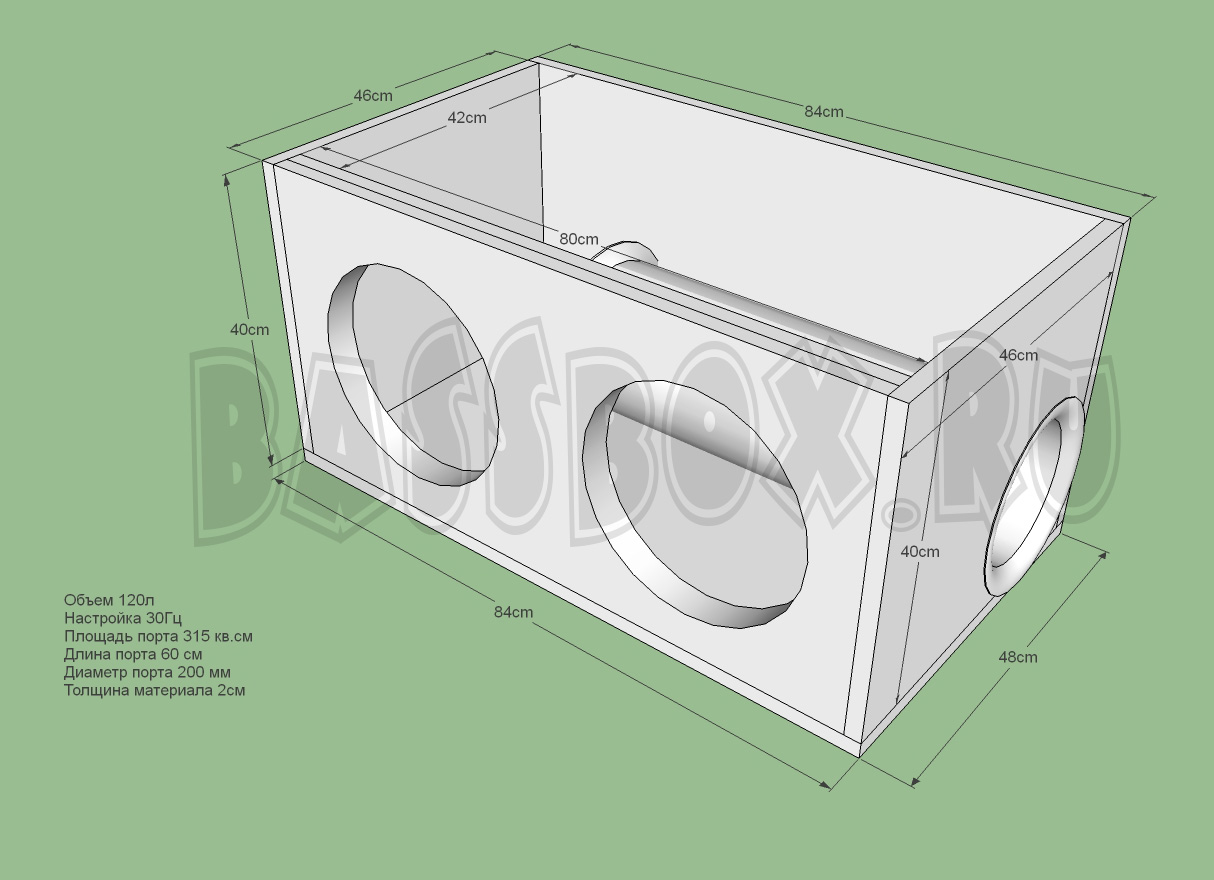 Фи короб для Machete MS-12D4 должен обладать объемом 65 литров и настройкой порта в 30 Гц. Эти параметры немного отличаются от рекомендованный производителем. Но на наш взгляд данные параметры Фи короба наиболее подходят для Machete MS-12D4. В данном коробе сабвуфер порадует вас плотным низким басом. Столь низкая настройка порта сделана специально чтобы сдвинуть рабочий диапазон частот с 50Гц до 40Гц. А также столь низкои настроикой мы выравниваем результирующую ачх короба.