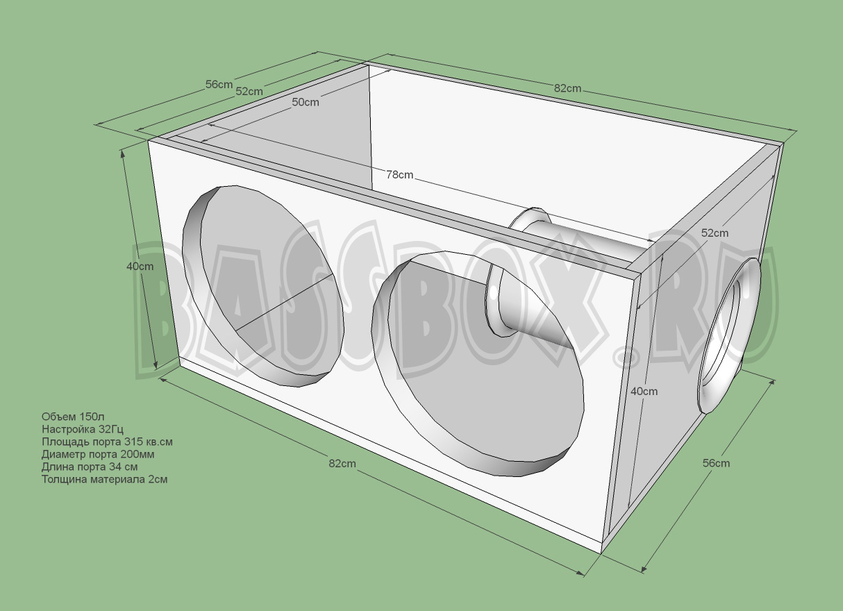 Чертеж ФИ короба 150л 32Гц на 200 трубе для двух Machete M15D2 Sport.