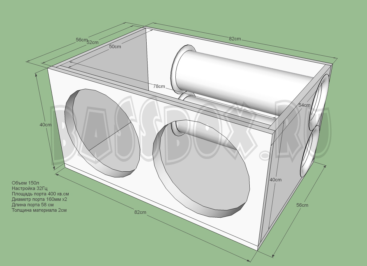 Чертеж ФИ короба 150л 32Гц на двух 160 трубах трубе для двух Machete M15D2 Sport.