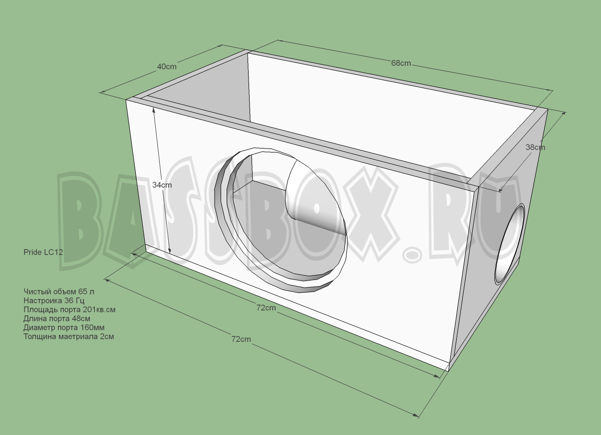 Фи короб для сабвуфера Pride LC 12 v2 должен обладать объемом 60 литров и настройкой порта в 36 Гц. Данные параметры Фи короба наиболее подходят для Pride Lc 12 v2. Благодаря оптимальному объему короба и площади порта а также двойной передней стенке в данном коробе сабвуфер порадует вас плотным низким басом.