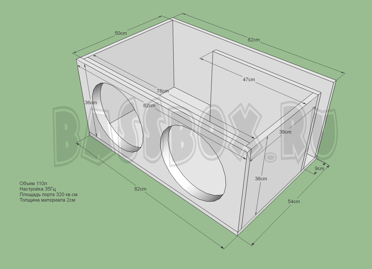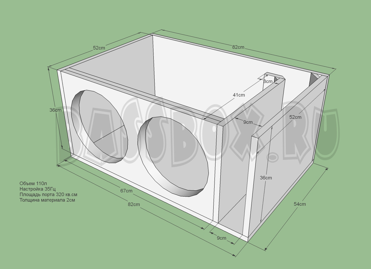 Чертеж ФИ короба 110л 35Гц с портом в бок ( с портом в крыло ) для двух Pride Junior 12.