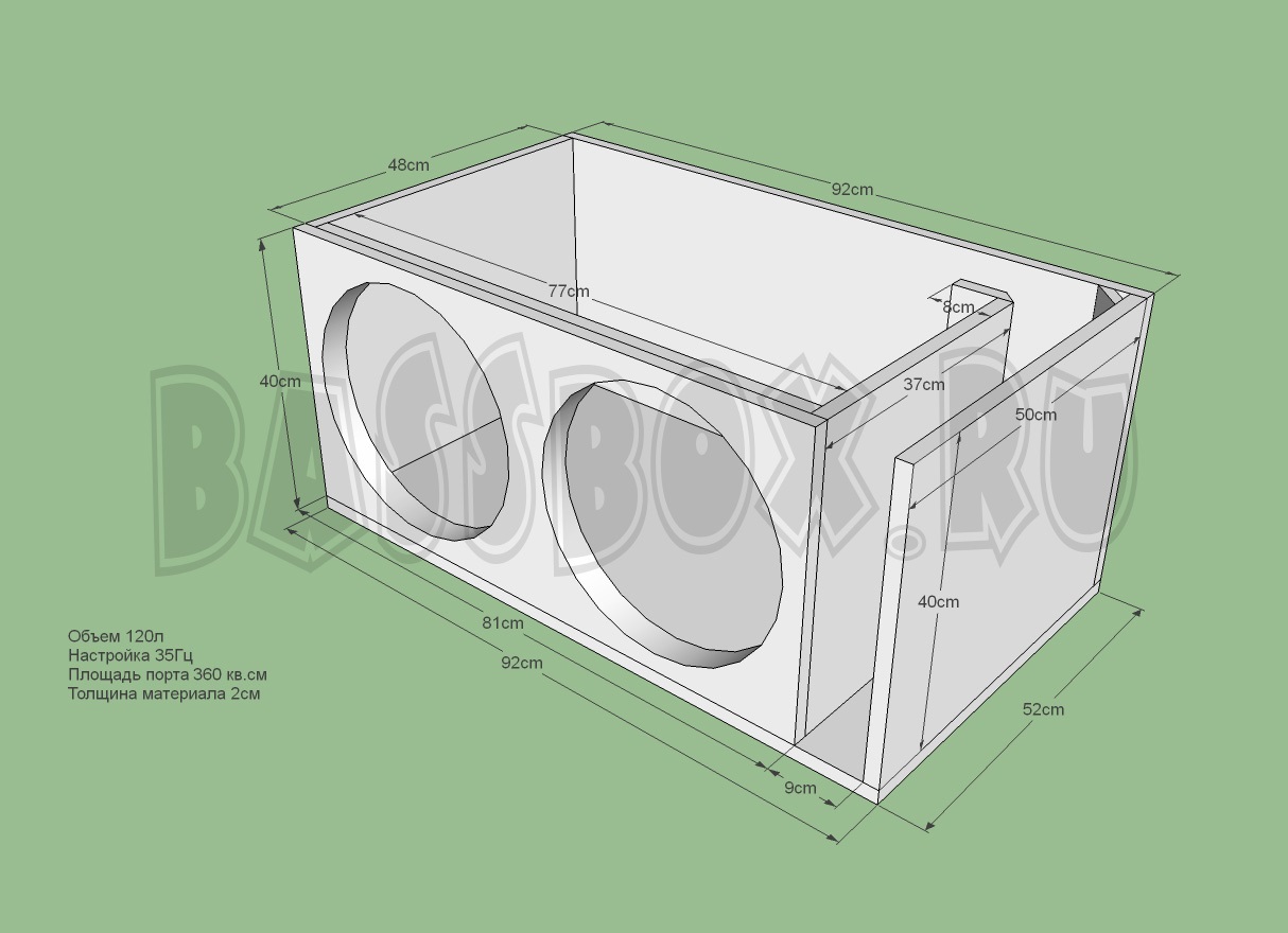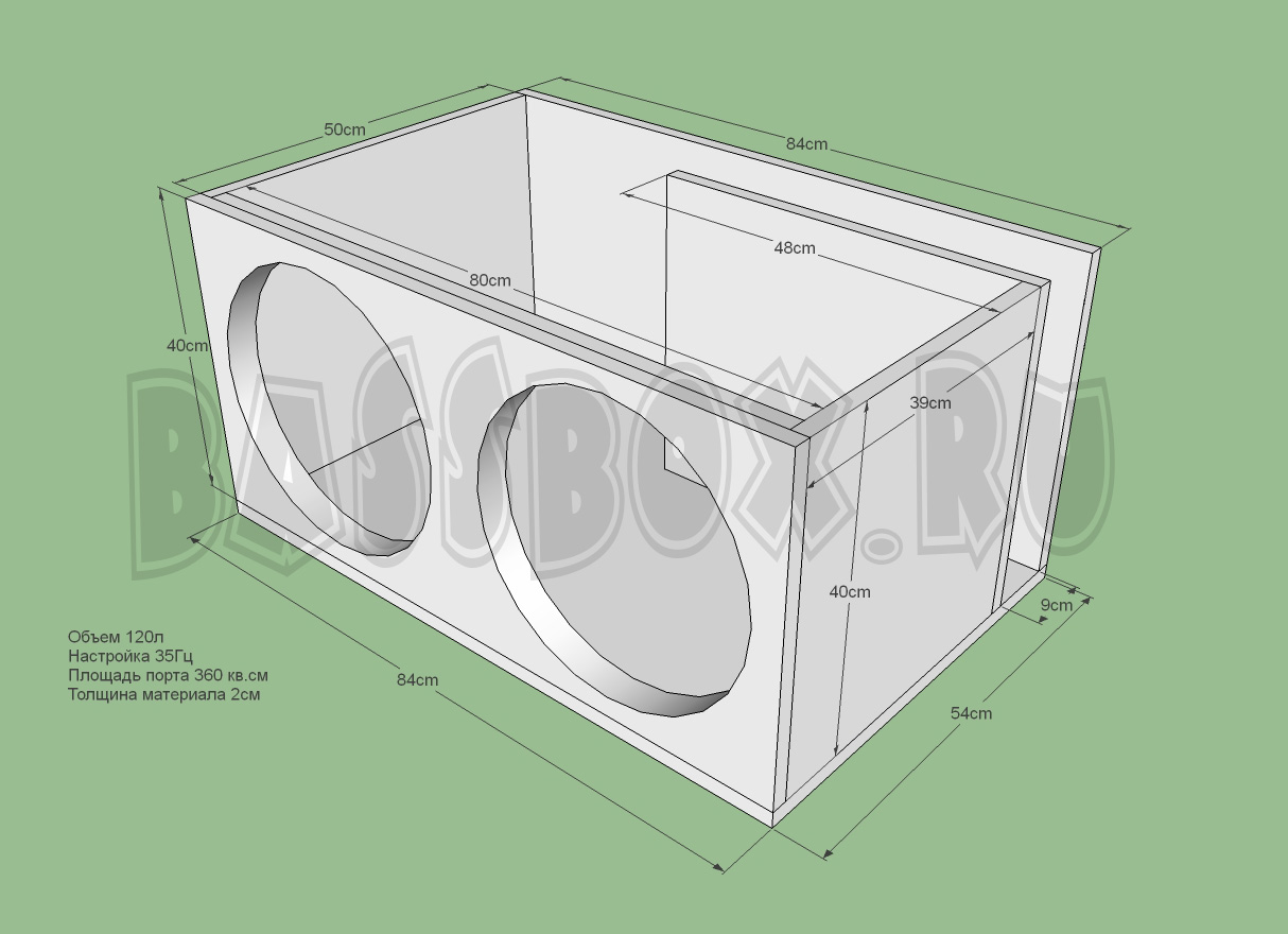 Чертеж ФИ короба 120л 35Гц с портом в бок ( с портом в крыло ) для двух Pride HP 15.