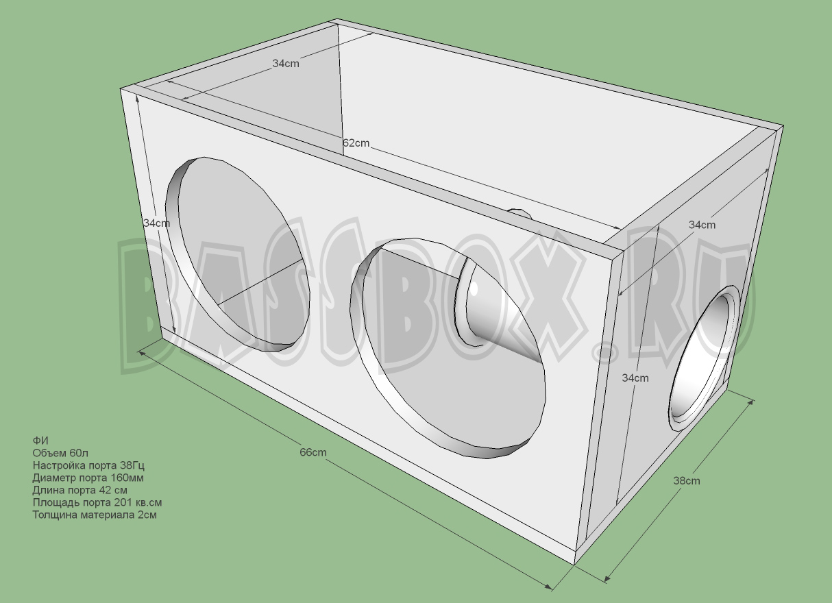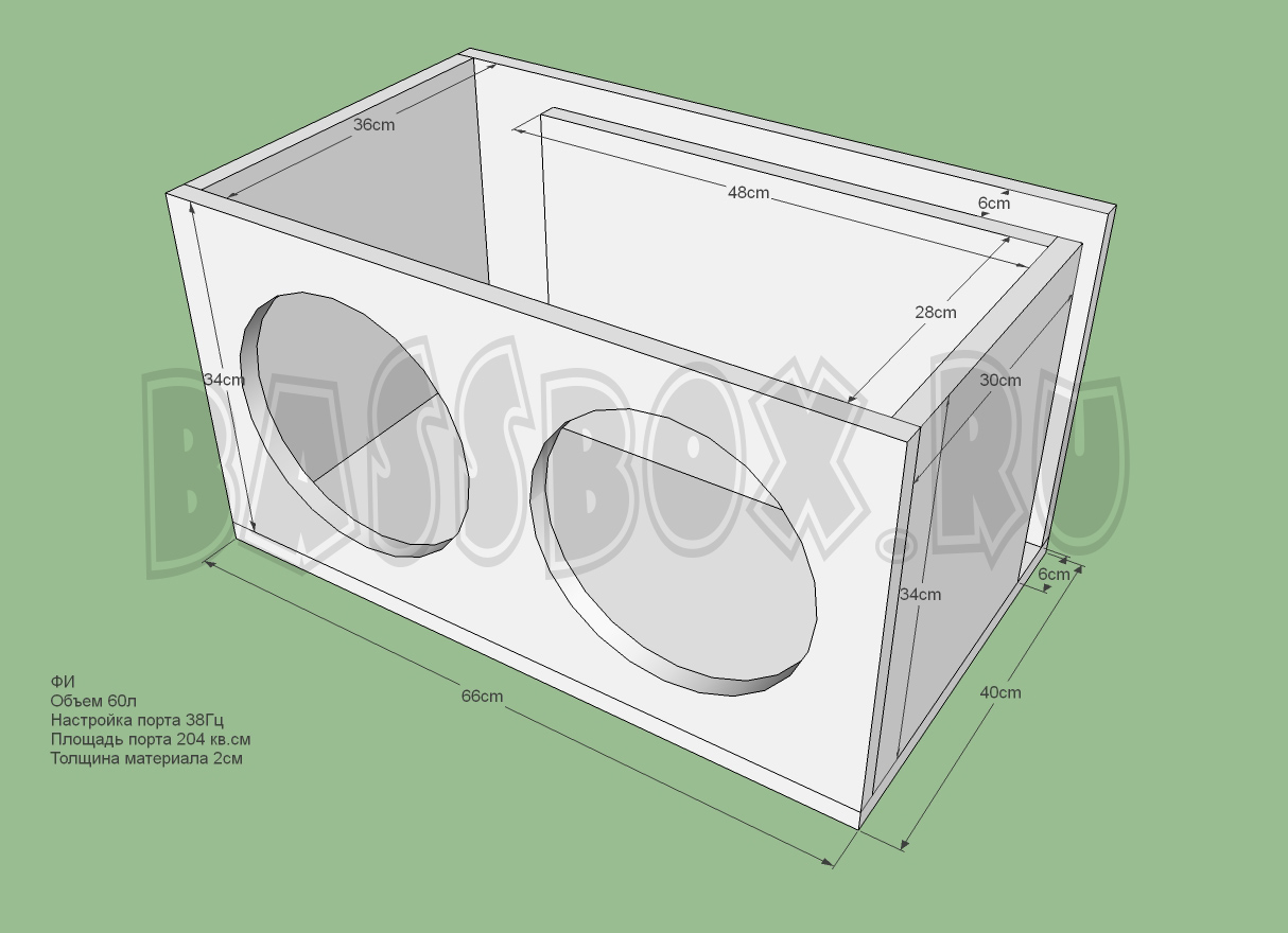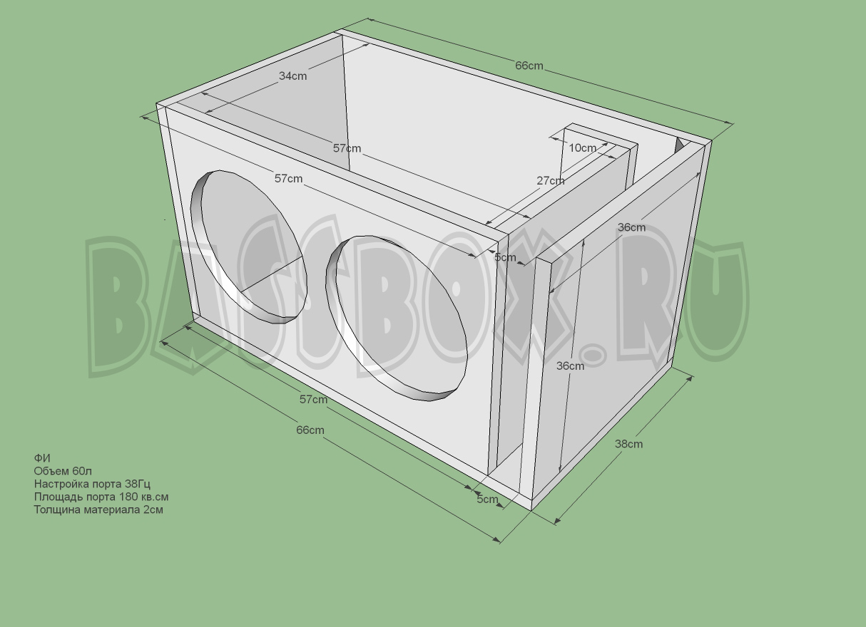 Чертеж ФИ короба 90л 35Гц с портом в бок ( с портом в крыло ) для двух URAL (Урал) AS-P10.5