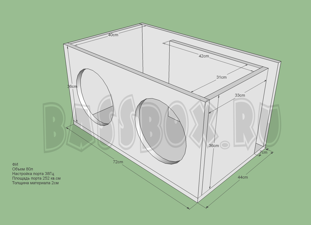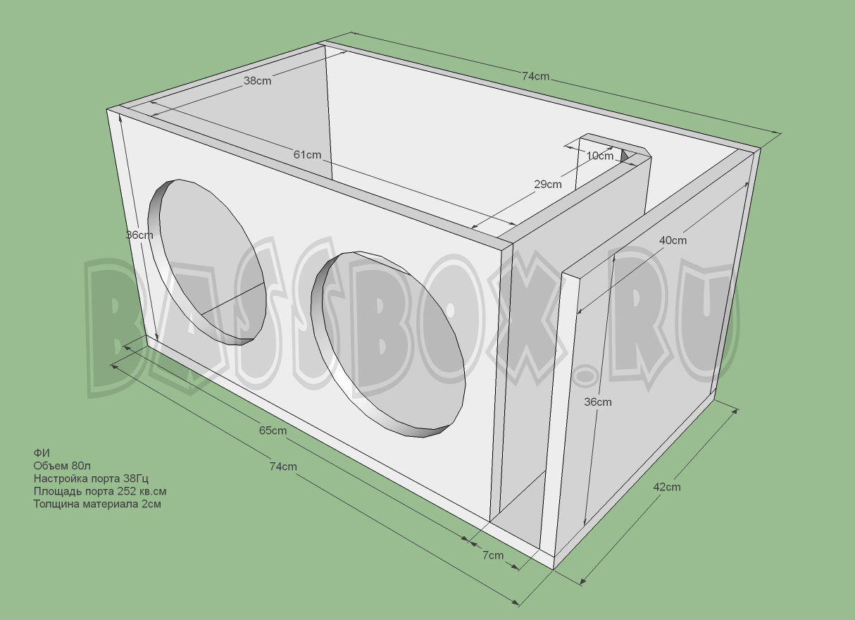 Чертеж ФИ короба 80л 38Гц с портом в бок ( с портом в крыло ) для двух URAL (Урал) Bulava 10