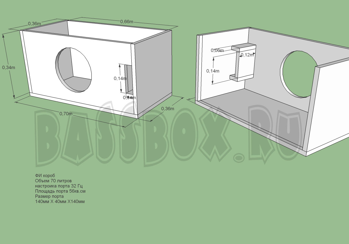Объем ящика с фазоинвертором составит 70 литров, если сделать корпус меньшего размера, то ачх короба будет кривая, а звук в итоге будет некомфортным для прослушивания. Так как ход динамика не может быть большим площади порта в 56кв.см будет предостаточно. Увеличивать площадь порта и тем самым раздувать еще больше объем короба смысла не вижу, он и так очень большой.