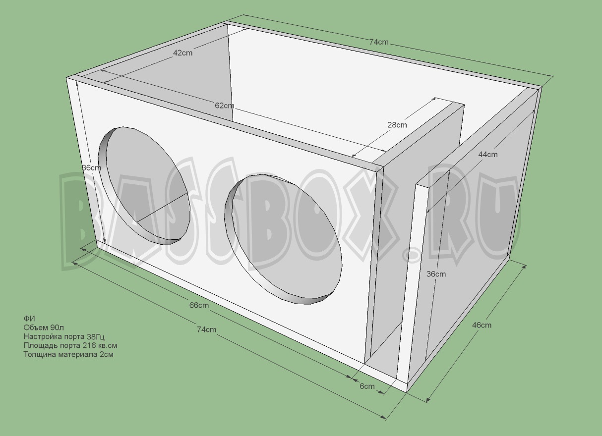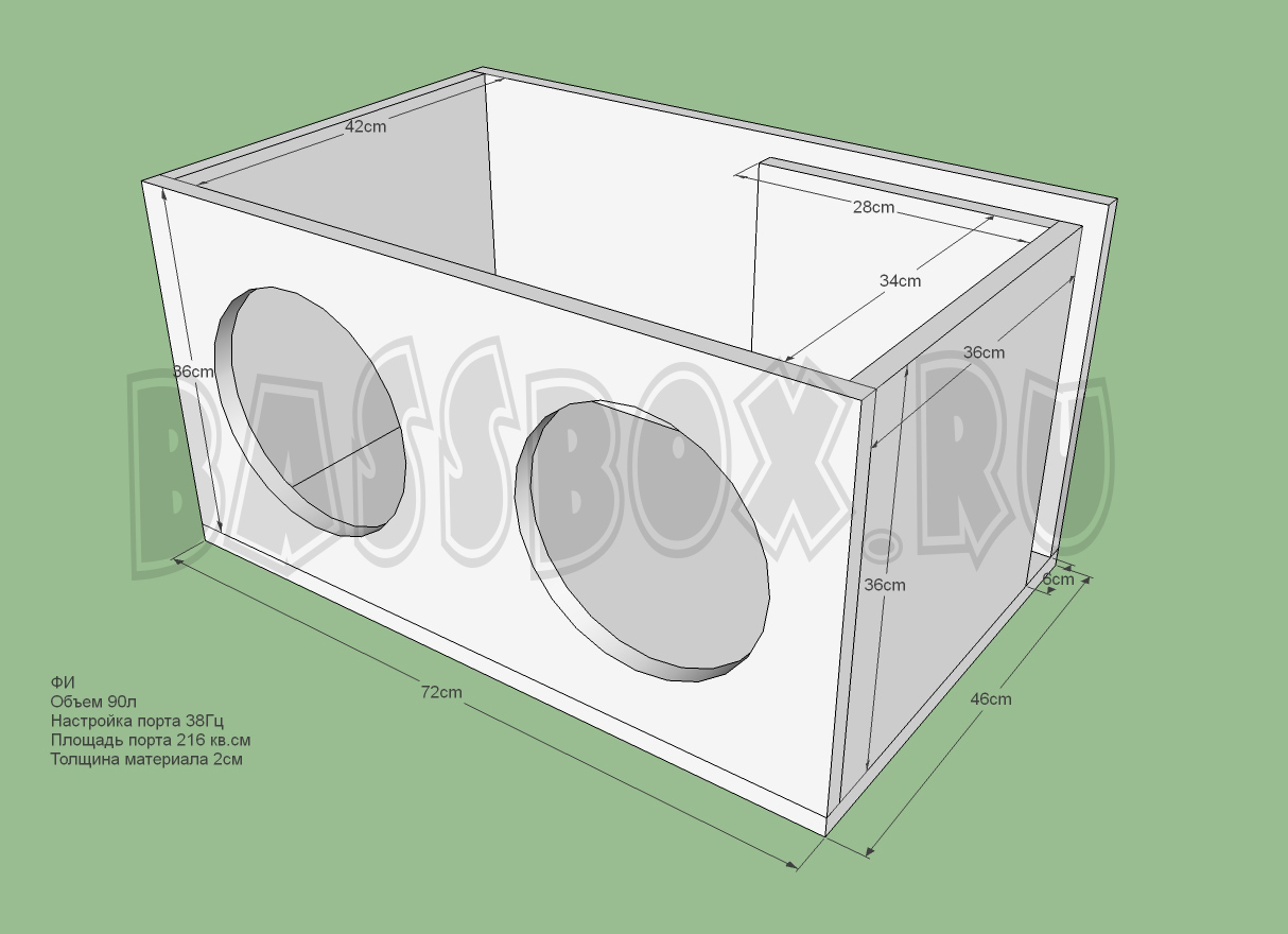 Чертеж ФИ короба 90л 38Гц с портом в бок ( с портом в крыло ) для двух URAL (Урал) AS-C10.7.