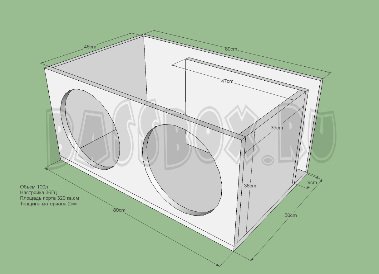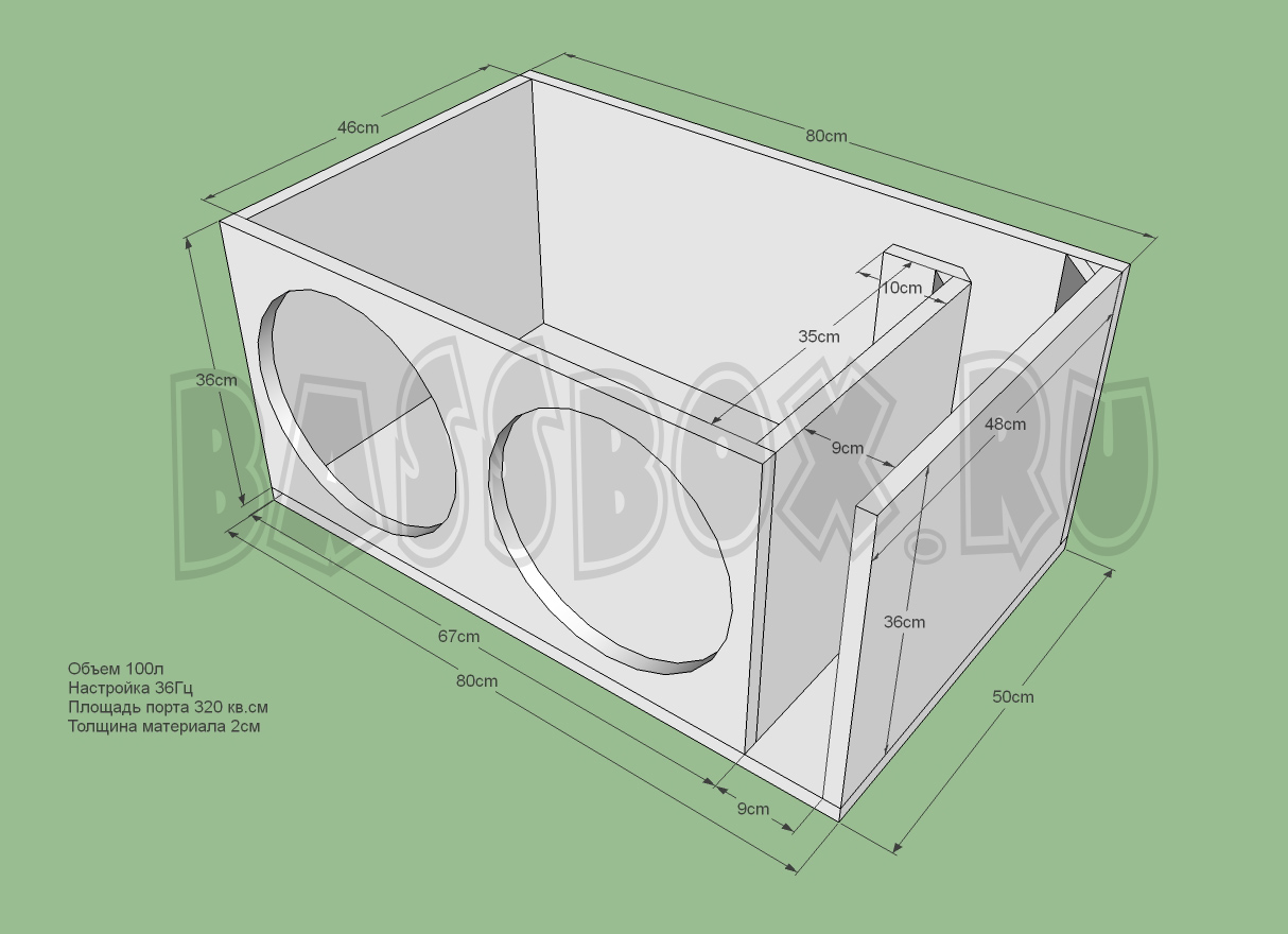 Чертеж ФИ короба 100л 36Гц с портом в бок ( с портом в крыло ) для двух URAL (Урал) TT 12.