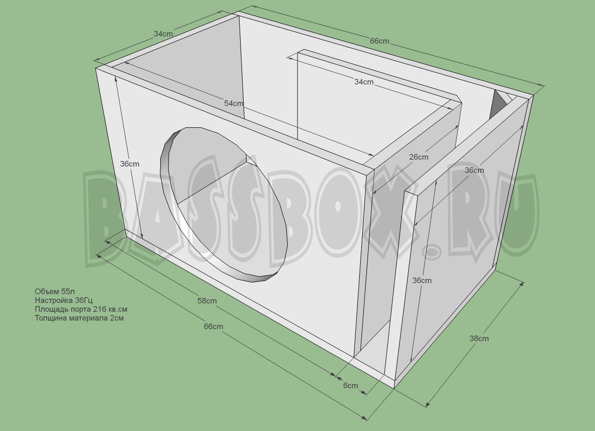 Чертеж ФИ короба 55л 36Гц c портом в бок ( с портом в крыло) для URAL (Урал) TT 12