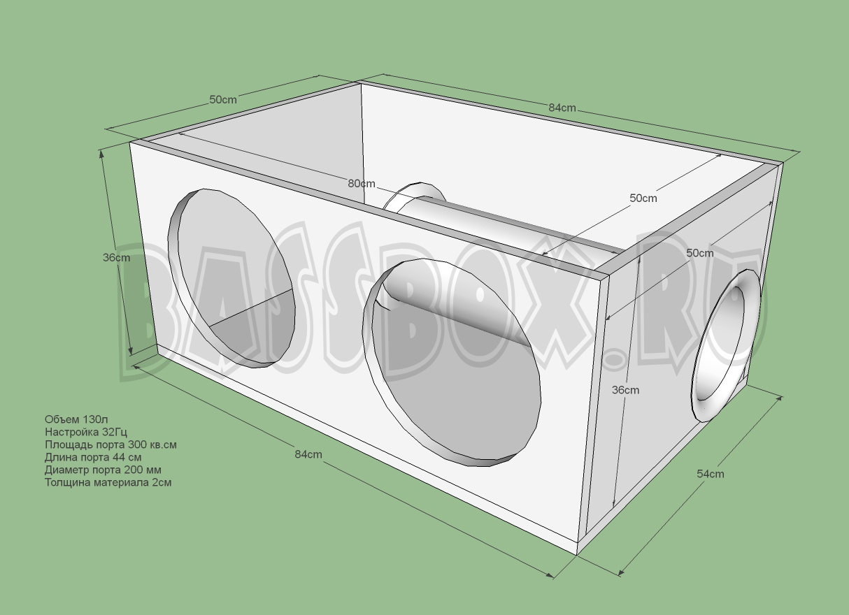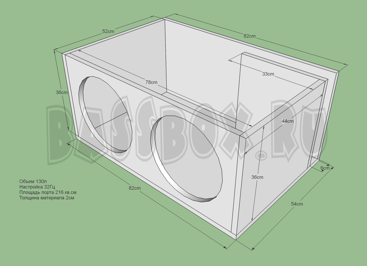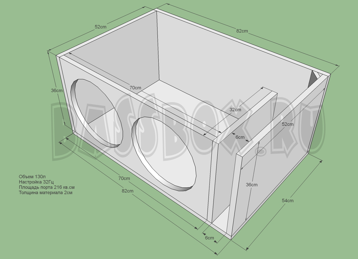 Чертеж ФИ короба 130л 32Гц с портом в бок ( с портом в крыло ) для двух URAL (Урал) Molot 12