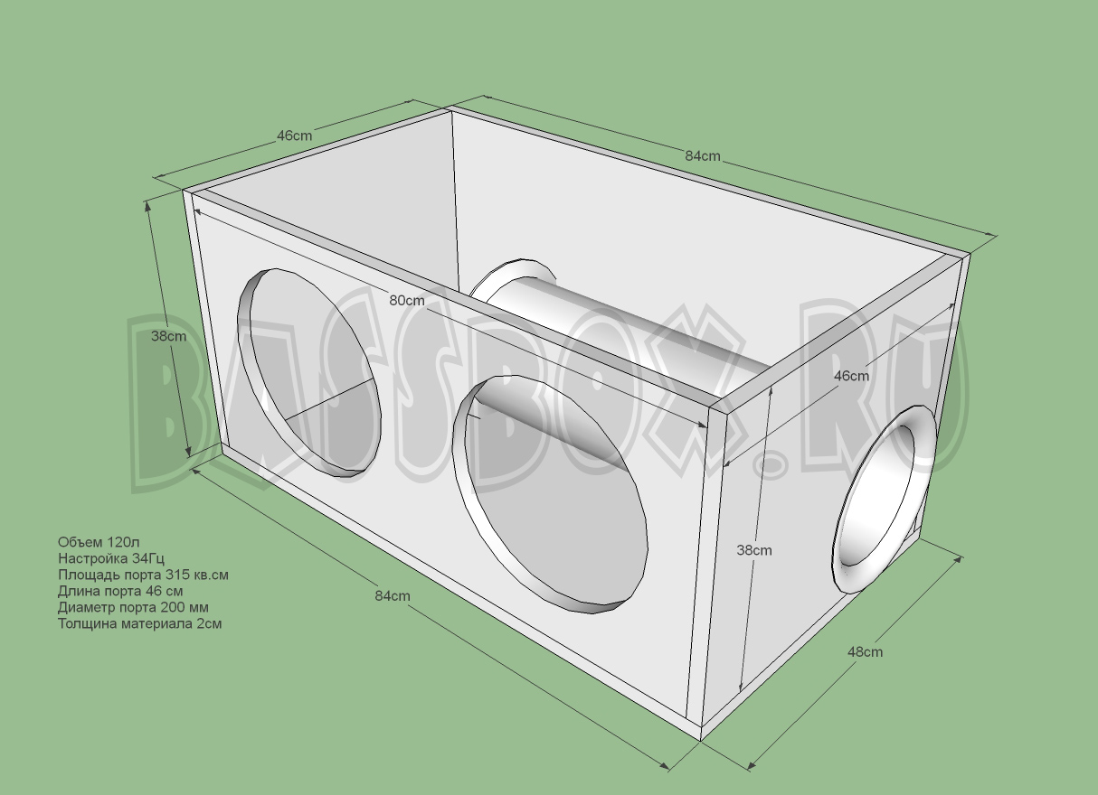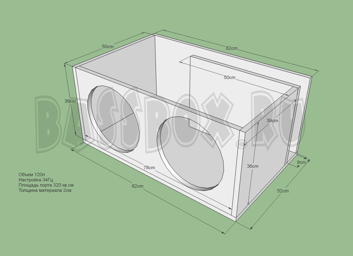 Чертеж ФИ короба 120л 34Гц с портом в бок ( с портом в крыло ) для двух URAL (Урал) AS-D12.3D2 ARMADA