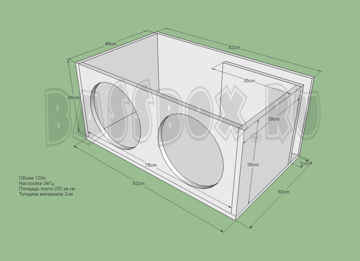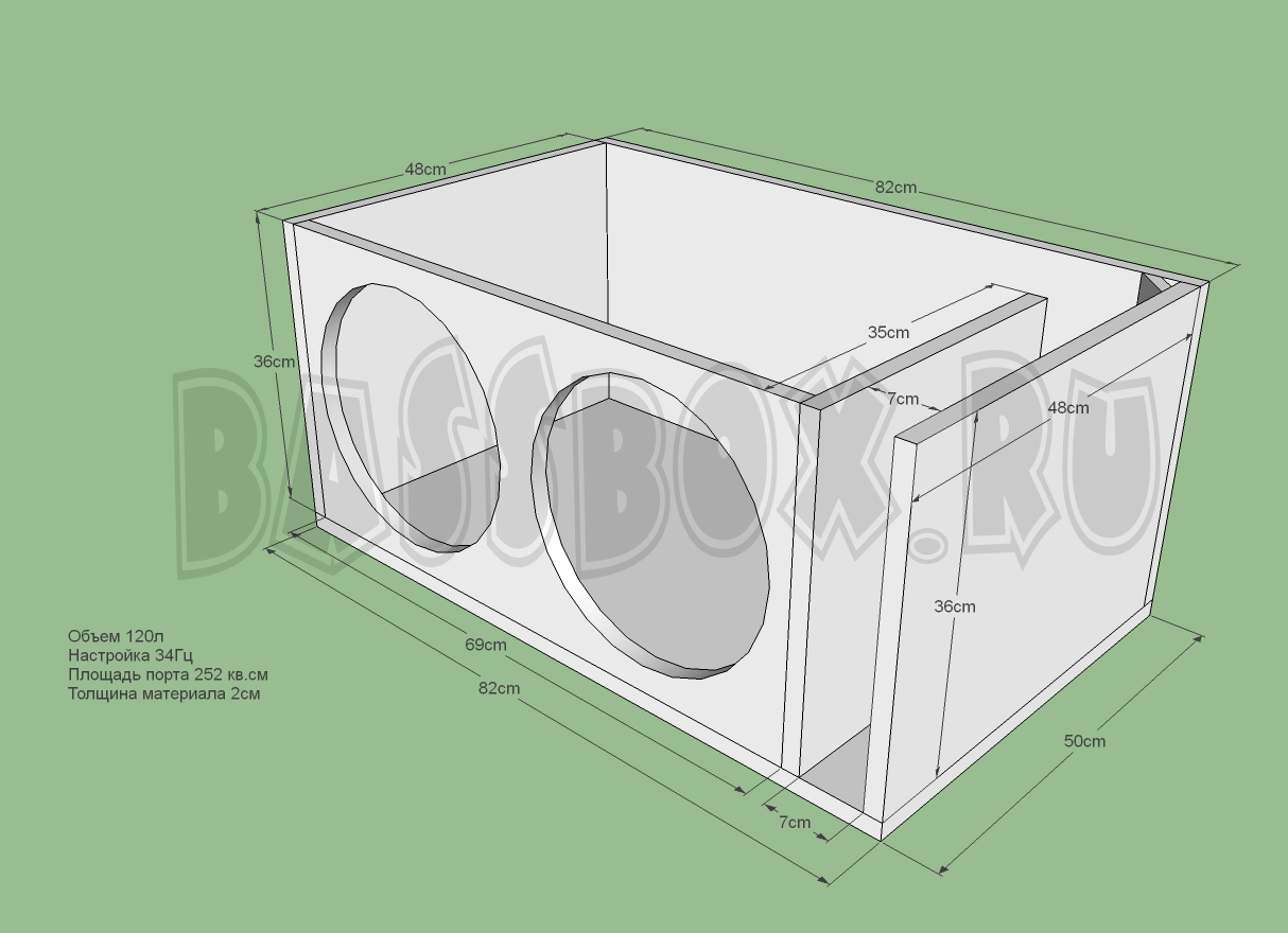 Чертеж ФИ короба 120л 34Гц с портом в бок ( с портом в крыло ) для двух URAL (Урал) AS-P12.5