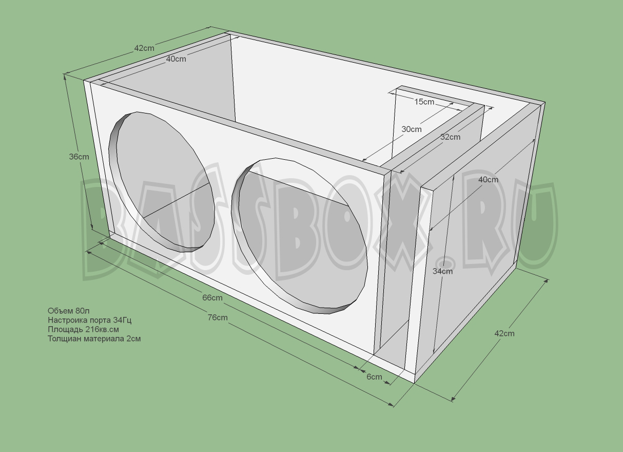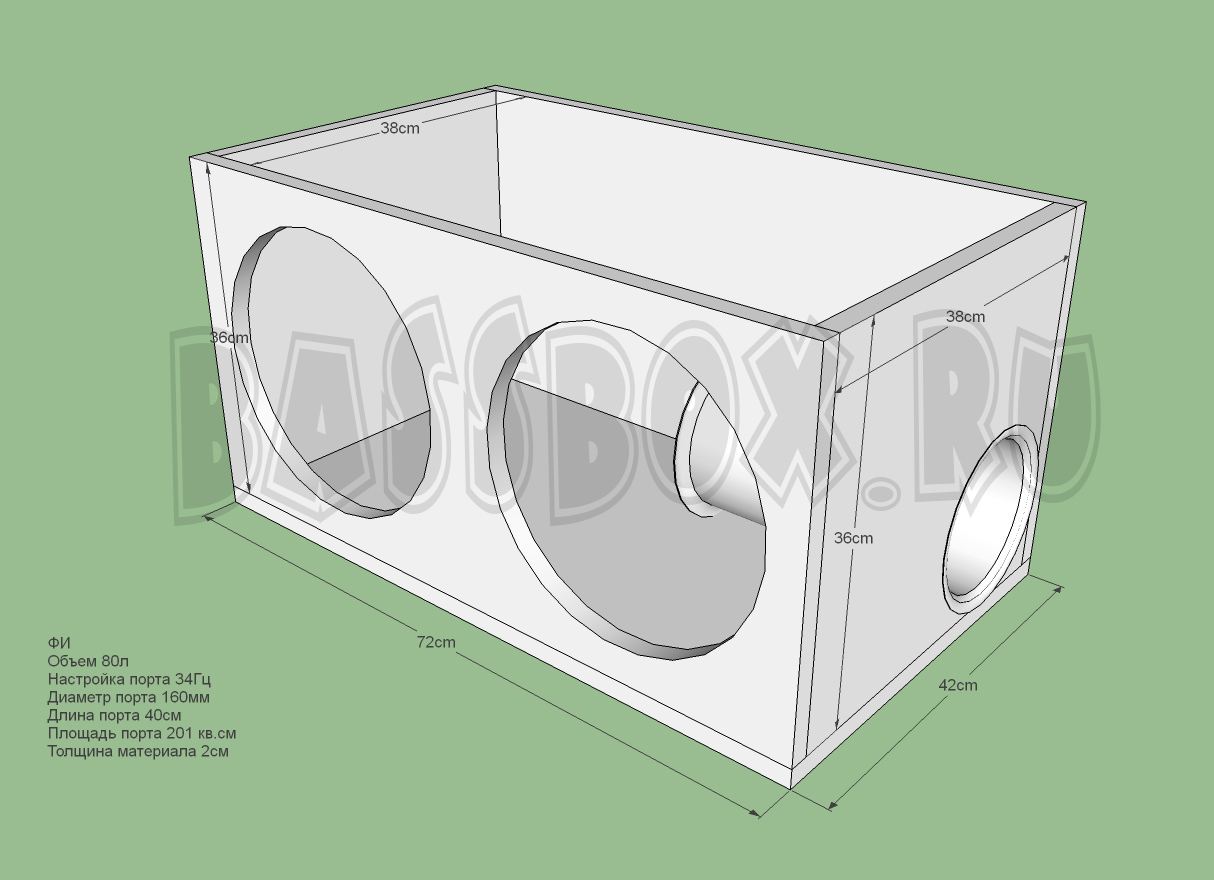 Чертеж ФИ короба 80л 34Гц с портом в бок ( с портом в крыло ) для двух URAL (Урал) AS-P12.5