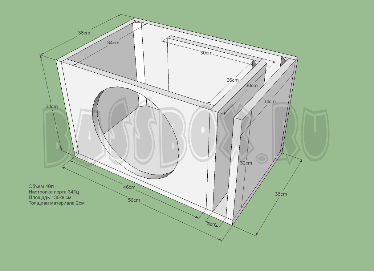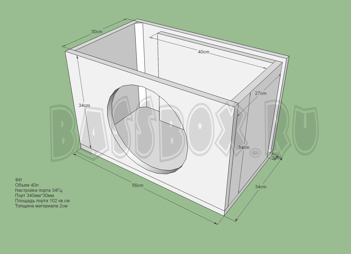 Чертеж ФИ короба 40л 34Гц c портом в бок ( в крыло ) для URAL (Урал) AS-P12.5