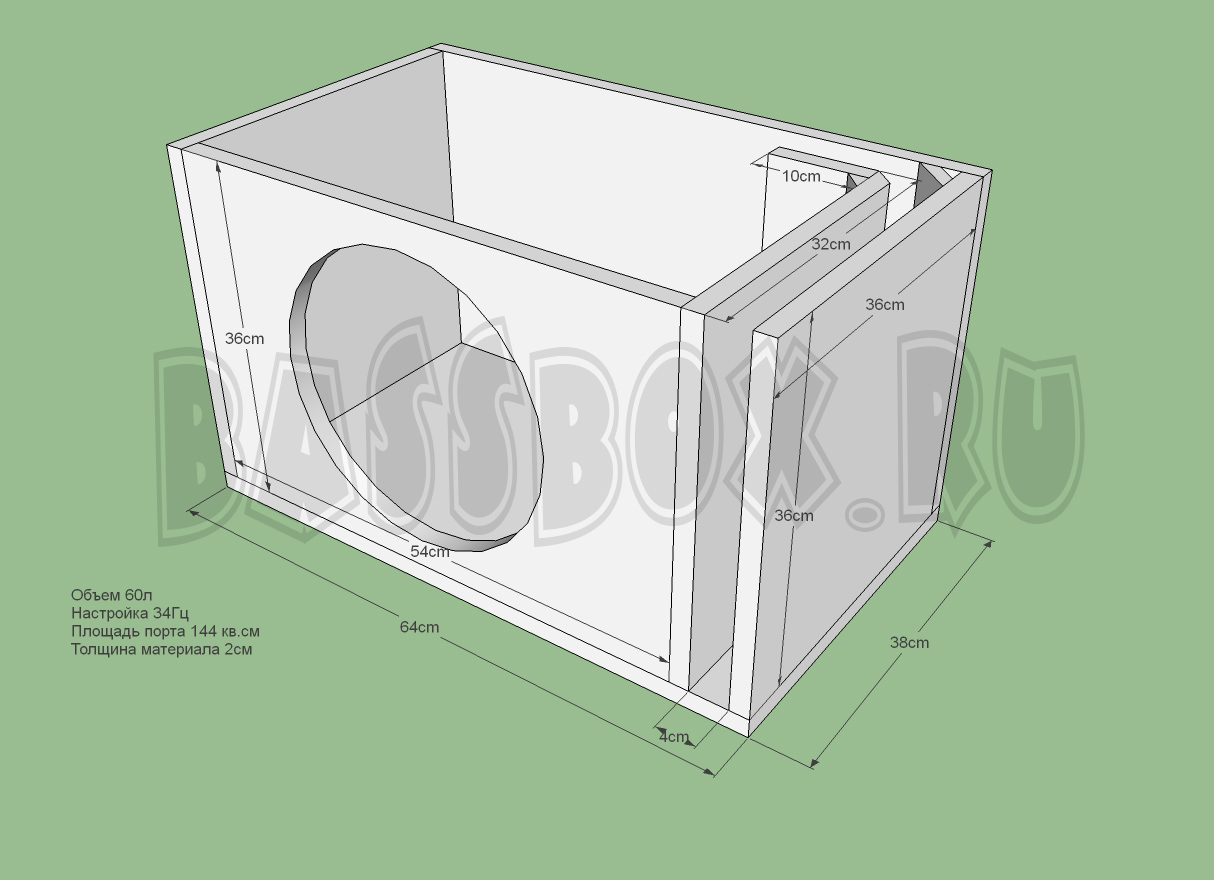 Чертеж ФИ короба 60л 34Гц c портом в бок ( в крыло ) для URAL (Урал) AS-P12.5
