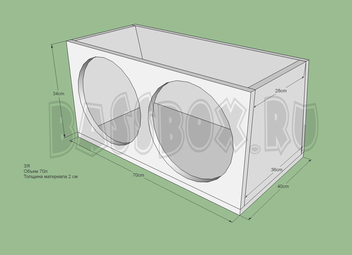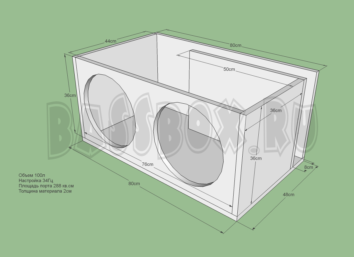 Чертеж ФИ короба 100л 34Гц с портом в бок ( с портом в крыло ) для двух URAL (Урал) AS-W12SW GRAND2