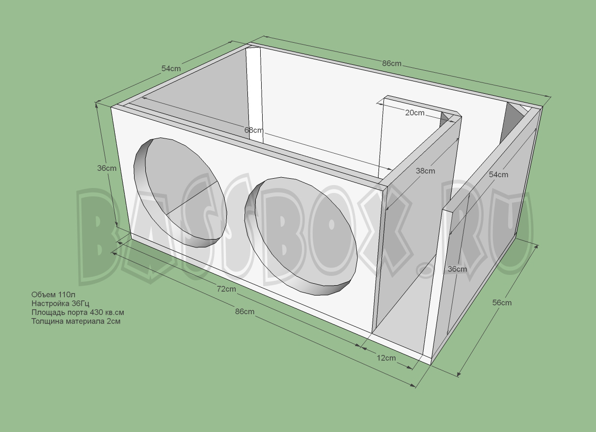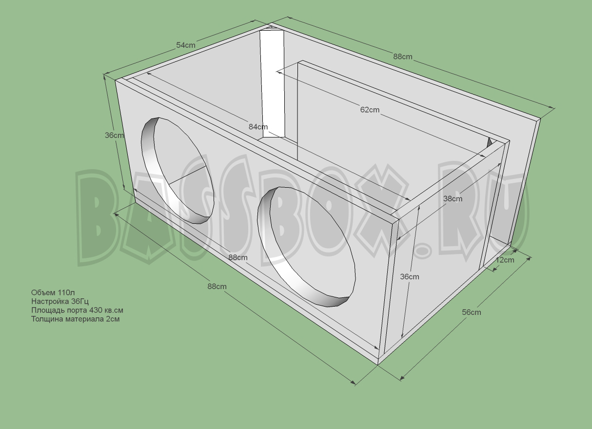 Чертеж ФИ короба 110л 36Гц с портом в бок ( с портом в крыло ) для двух Bulava 12