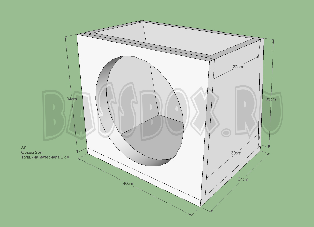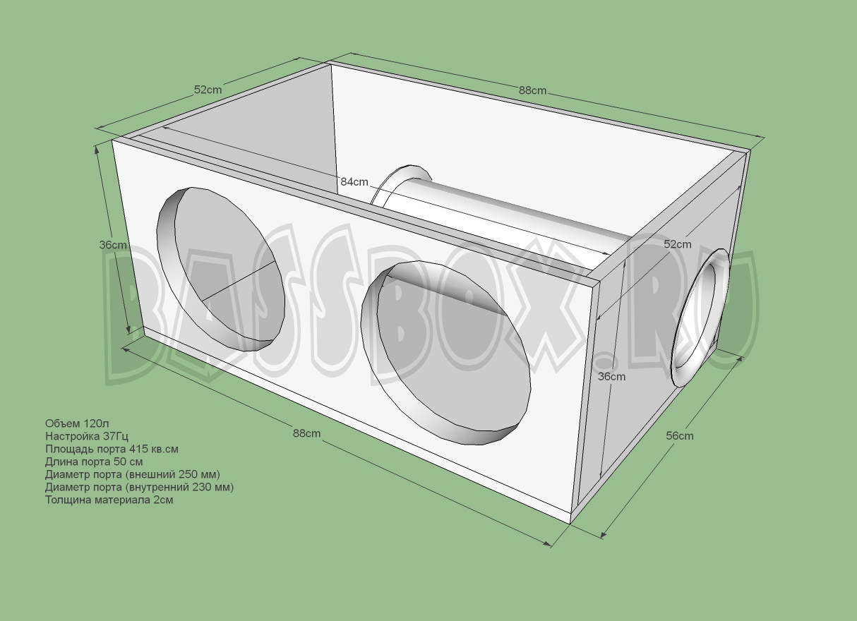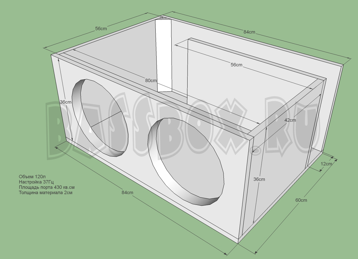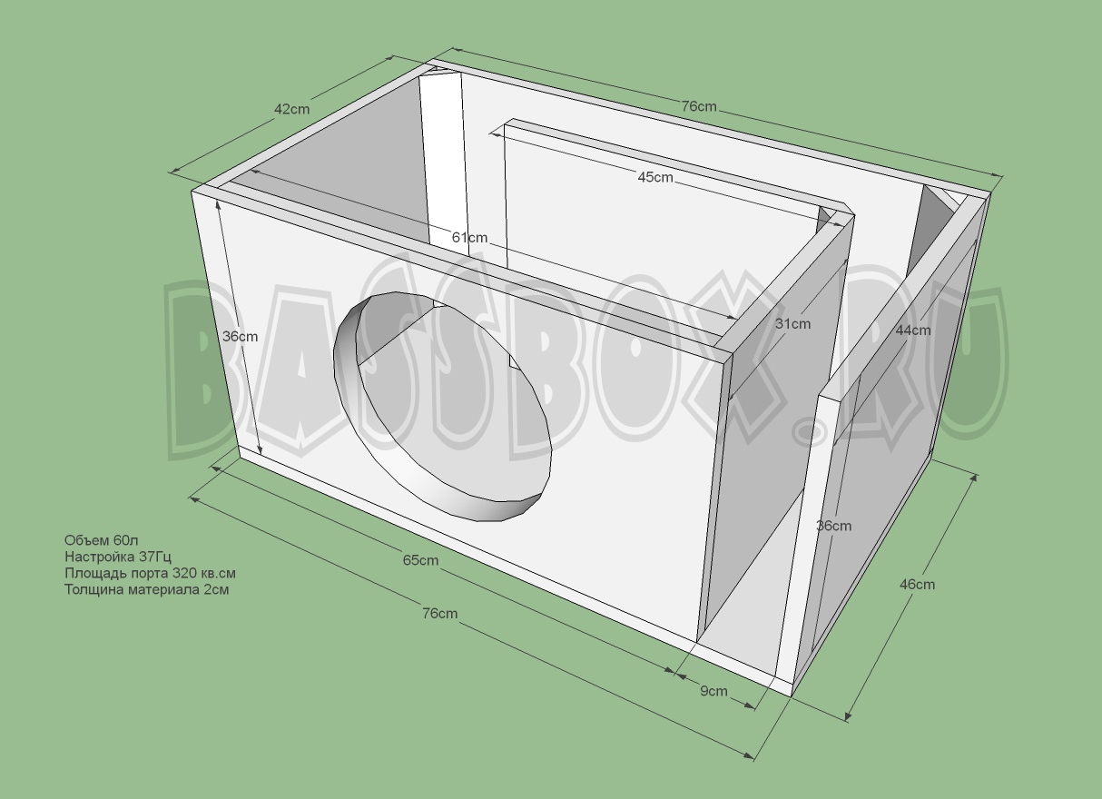 Фи короб для URAL (Урал) Patriot 12 должен иметь объем не менее 60литров и настройку порта 36-38Гц. В примере короба используется частота настройки порта 37 Гц. Двойная передняя стенка короба обязательна.