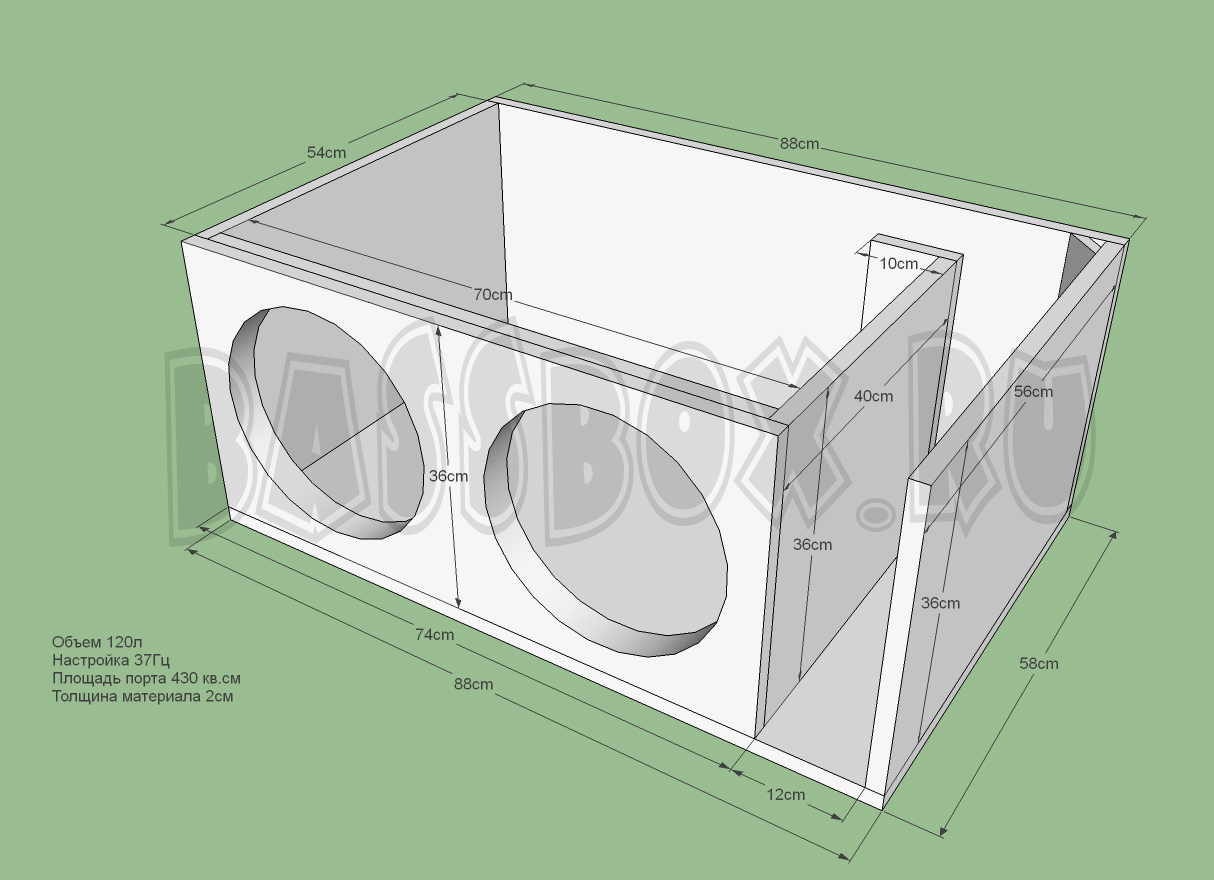 Чертеж ФИ короба 120л 37Гц с портом в бок ( с портом в крыло ) для двух Pobeda 12