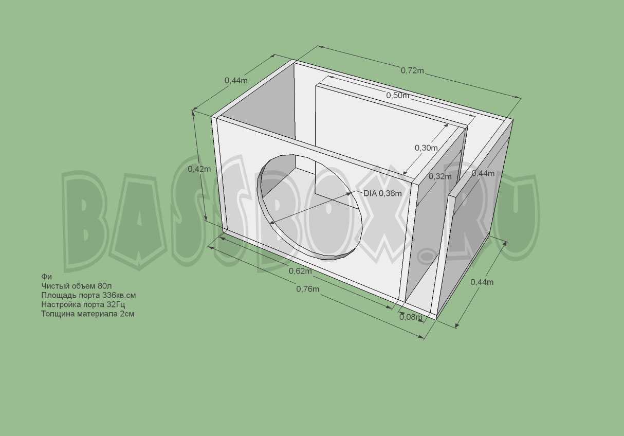 Фазоинверторный "ФИ" короб для URAL (Урал) Pobeda 15 требует не менее 80 литров объема. Порт желательно настраивать на частоту 32-34 Гц, чтобы увеличить итоговый рабочий диапазон. Площадь порта в 340 кв.см будет наиболее оптимальна из расчета площади диффузора сабвуфера и его хода. Приветствуется двоиная пеердняя стенка для повышения жесткости конструкции.