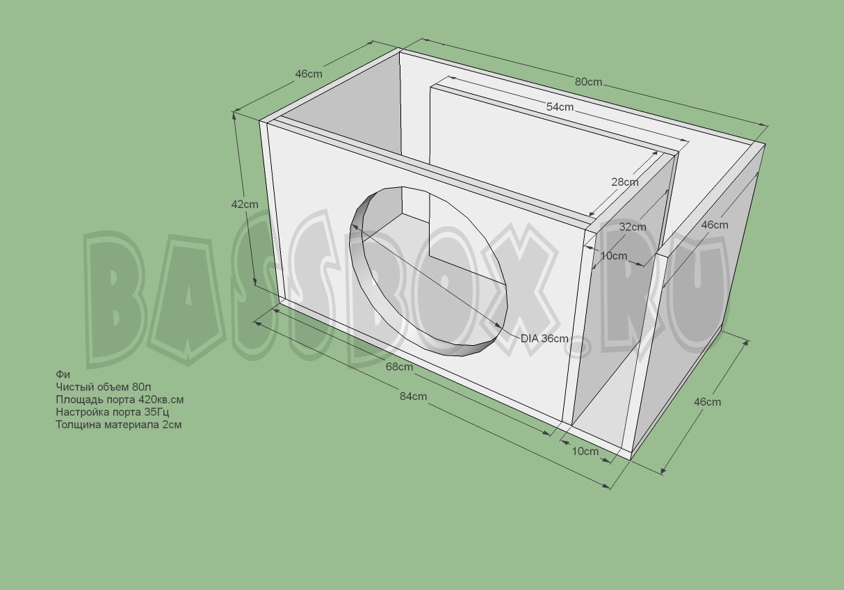 Фазоинверторный "ФИ" короб для URAL (Урал) Patriot 15 требует 80 литров объема. Порт желательно настраивать на частоту 35 Гц. Площадь порта в 420 кв.см будет наиболее оптимальна из расчета площади диффузора сабвуфера и его рабочего хода. Очень желательна двоиная пеердняя стенка для повышения жесткости конструкции.