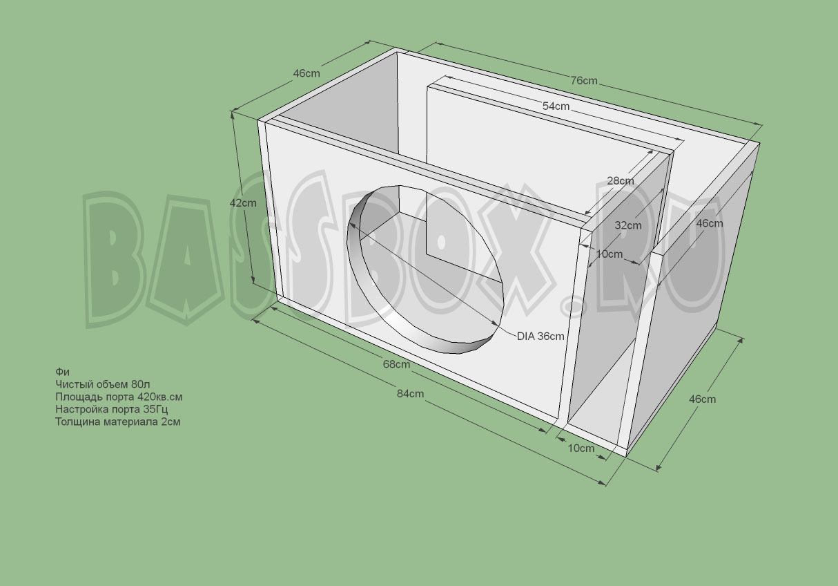 Фазоинверторный "ФИ" короб для URAL (Урал) Decibel 15 требует 80 литров объема. Порт желательно настраивать на частоту 35 Гц. Площадь порта в 420 кв.см будет наиболее оптимальна из расчета площади диффузора сабвуфера и его рабочего хода. Обязательна двоиная пеердняя стенка для повышения жесткости конструкции.